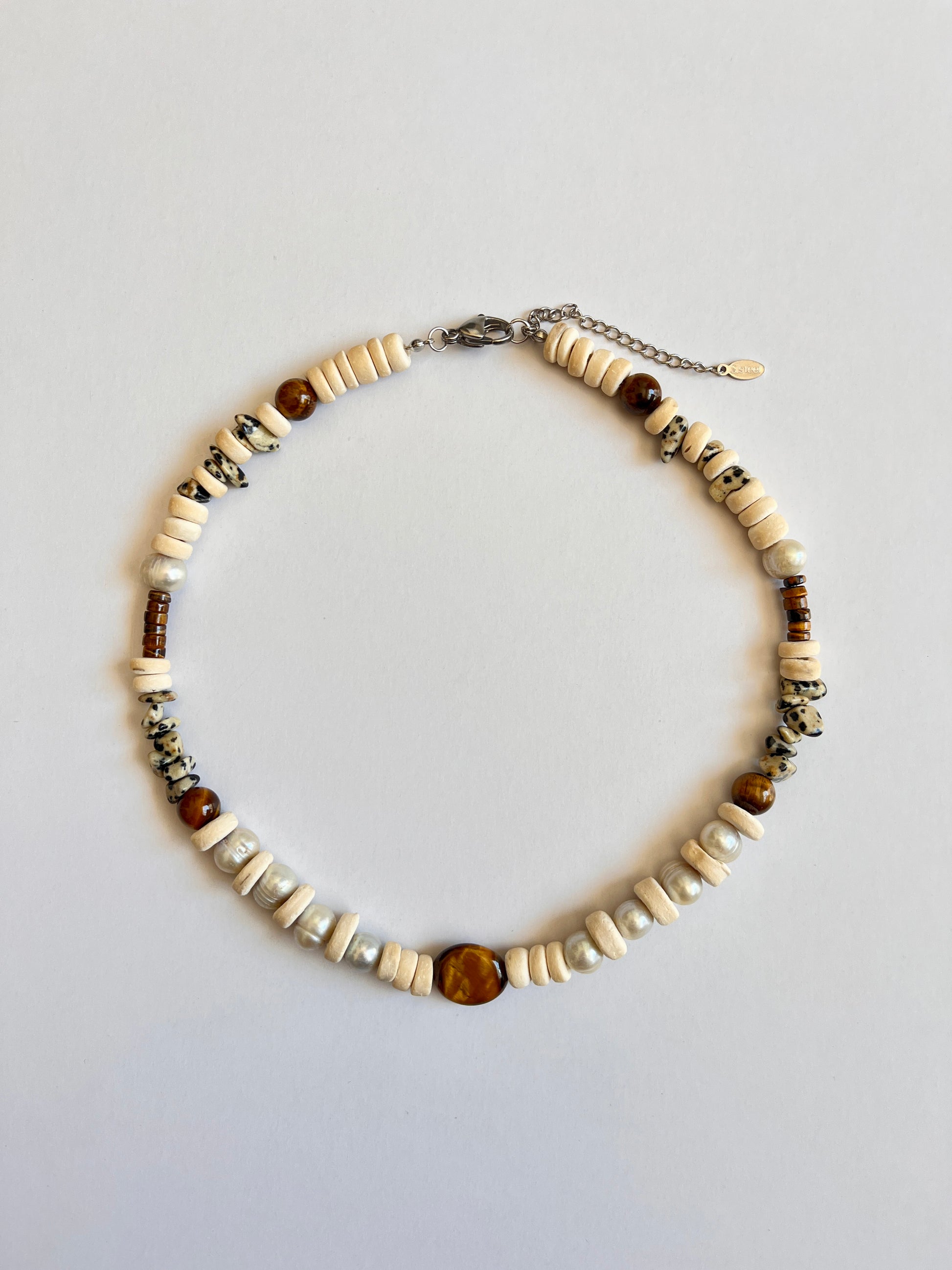 tigers eye, wooden beads, pearls, jasper, stainless steel findings