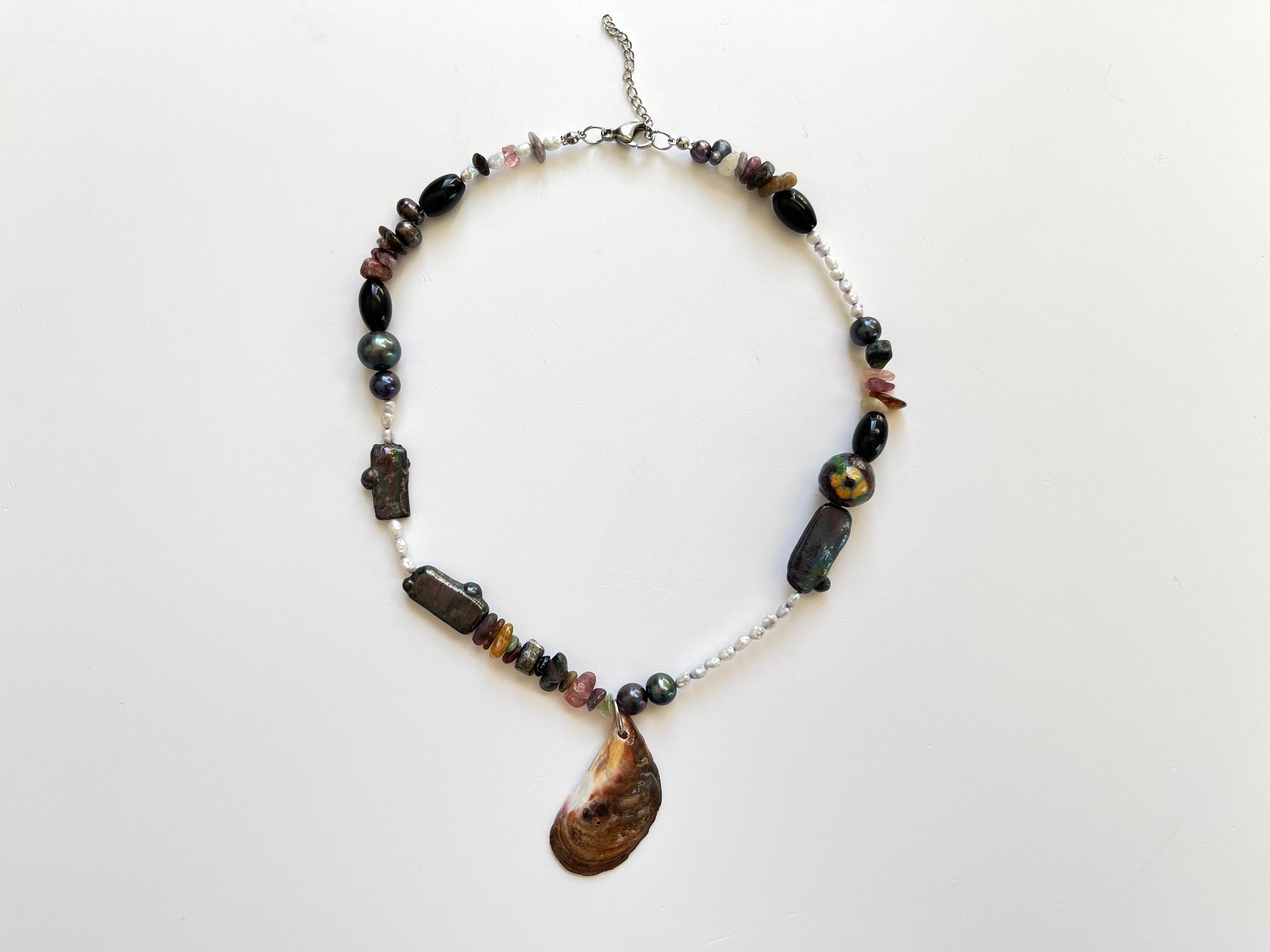 stainless steel findings, pearls, watermelon tourmailne, glass beads