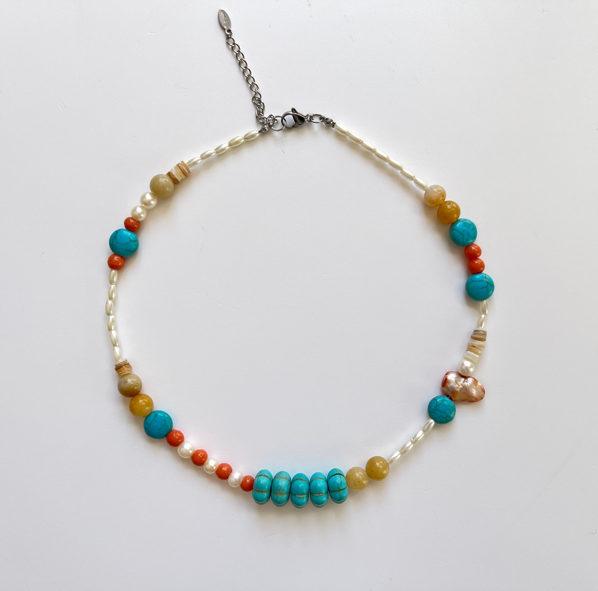 stainless steel findings, turquoise, pearls, yellow aventurine, mother of pearl, faux pearls